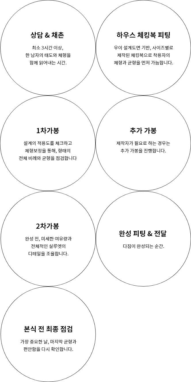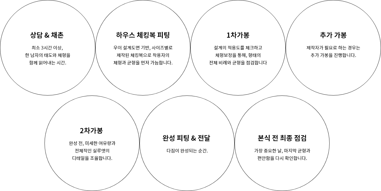 사이즈 채촌 → 체킹복 피팅 → 설계 → 재단 → 1차 가봉 → 설계도면 수정 → 2차 가봉 →